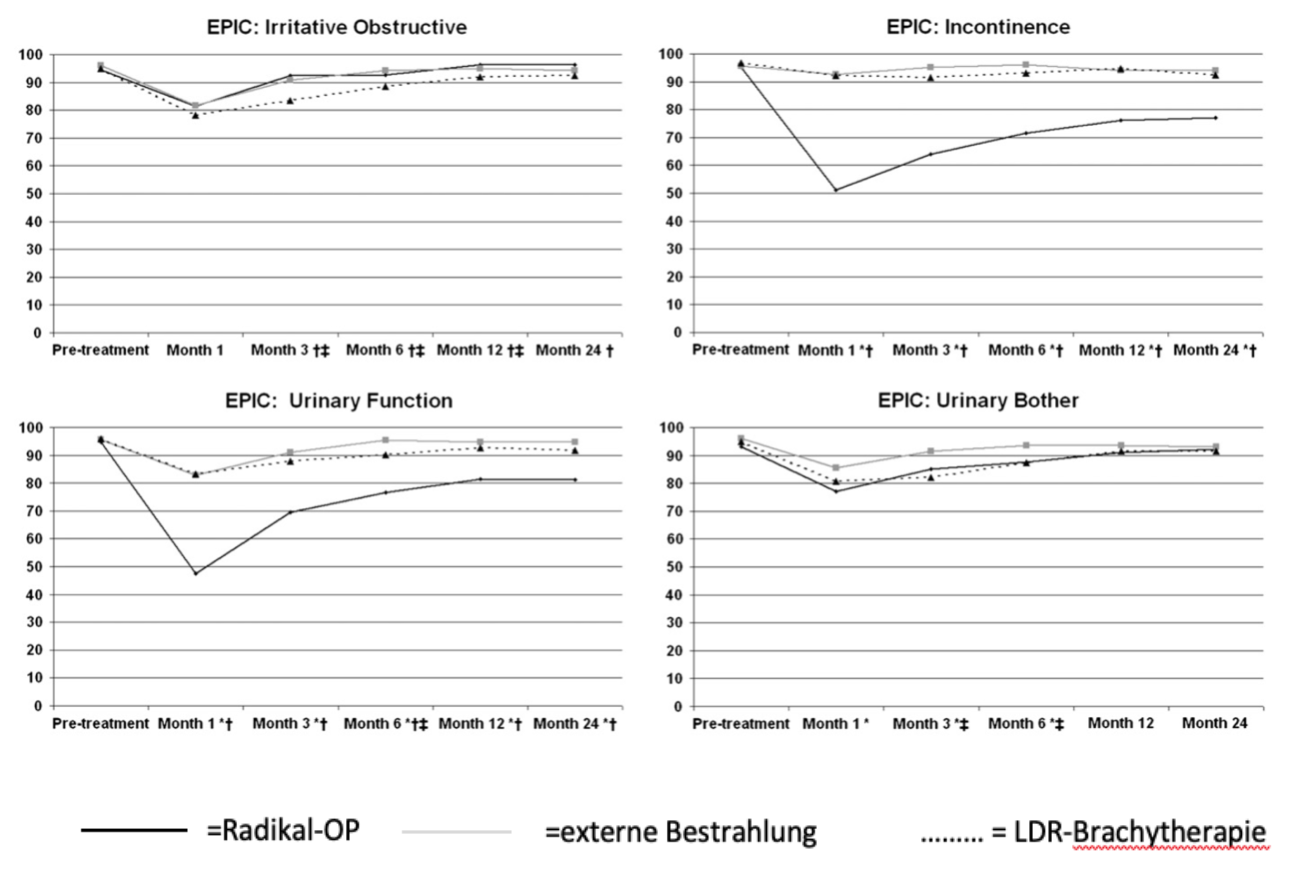 Die unserer Meinung nach beste Übersicht dazu bietet die Arbeit von Ferrer et al. (2008). In den jeweils ersten zwei Jahren nach der Behandlung mit Radikaloperation, externer Bestrahlung oder LDR-Brachytherapie wurden insgesamt 614 Patienten regelmäßig nachuntersucht.